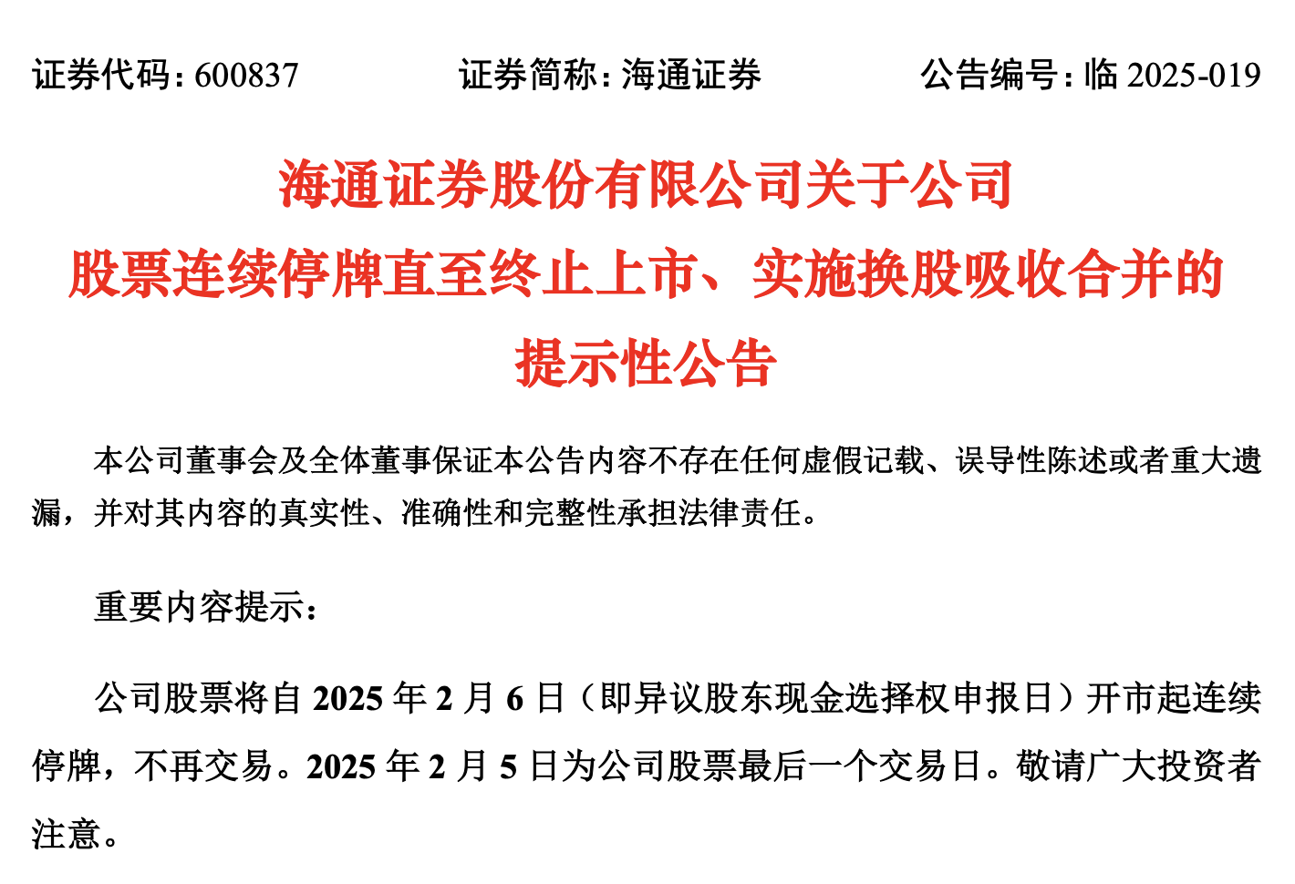随着“国泰君安+海通证券”合并重组事项的持续推进,2月5日,海通证券A股迎来了其最后的交易日。海通证券已多次发布关于公司股票连续停牌直至终止上市、实施换股吸收合并的提示性公告,提示公司股票将自2025年2月6日(即异议股东现金选择权申报日)开市起连续停牌,不再交易。2025年2月5日为公司股票最后一个交易日。敬请广大投资者注意。